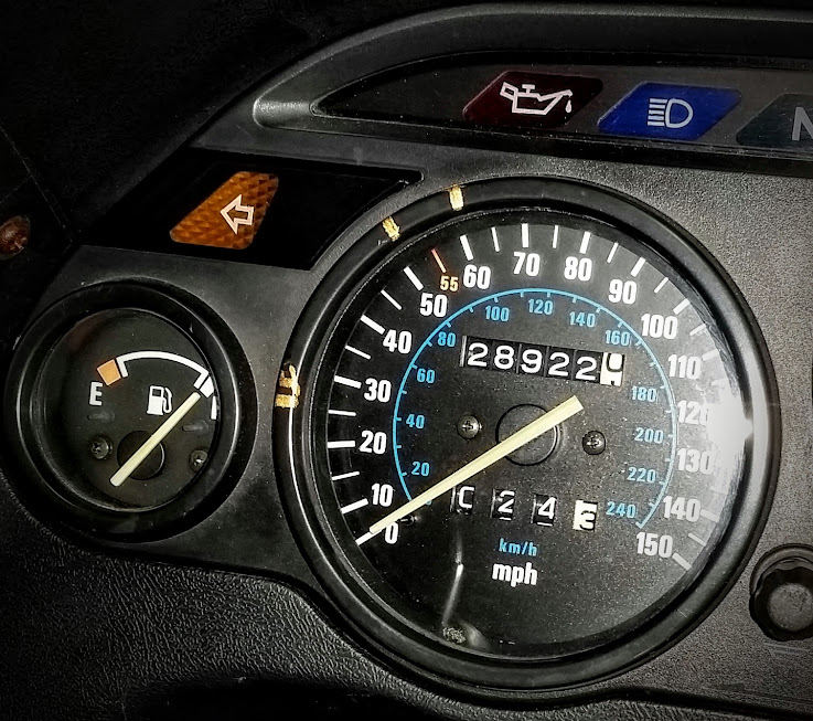 I discovered that with a 250lb rider, 120lb passenger, loaded panniers and top-box the bike could do the ton with ease. Even when making time on the interstates it still returned better gas mileage than a Prius and never dropped below the high 40s MPG… and all this through four carburetors!