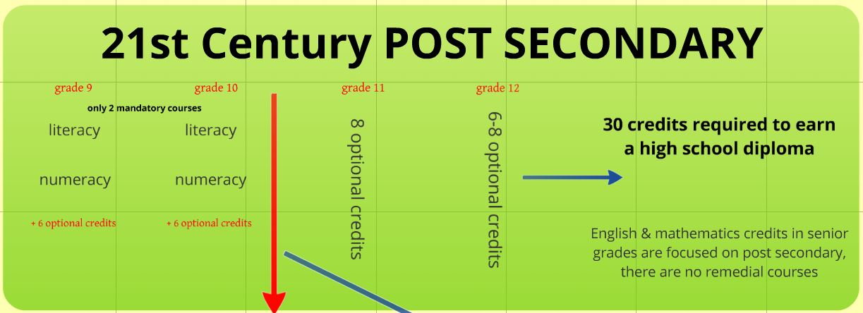 The idea for mandatory grade 9 and 10 literacy and numeracy courses comes from this logic. The grade 10 course is a survey/review course that works to assess students literacy skills in a granular and meaningful way. The opposite of a standardized test, these courses challenge students in order to accurately assess their skills in numeracy and literacy in detail. The end result would be a certification in two important foundational skills.