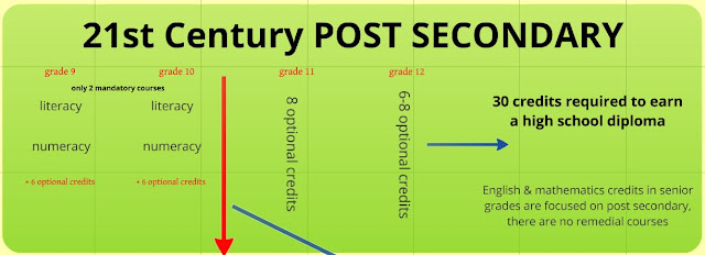 Students who are able to demonstrate these foundational skills are able to continue in high school in which ever direction they choose with a clear idea of their strengths or weaknesses in fundamentally skills, or move beyond the building and into apprenticeships or the work place knowing that they have displayed an appropriate level of literacy and numeracy. Their proven ability in these two vital skill sets will resolve many of the fears surrounding letting students leave school early. Those that stay in high school are offered a plethora of courses, local, remote or a hybrid of the two, that allow them to develop interests and abilities that are flexible, encourage their strengths and change with the times.