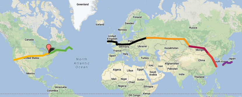 Leave Ontario April 1st and put up with some dodgy weather in Canada before making our way to Ireland in May and out of Europe. Across Russia and Siberia in early summer, and then south through Mongolia into China in later summer. End summer across Japan and then do a fall drive through the Western U.S. back to Ontario, returning before Hallow e’en. 214 days, 10 days crossing the Atlantic, 20 days crossing the Pacific, so 184 days on the road, which makes for an average of about 110kms/day, which should be more than possible (with some days off too!). It’ll be slower in some places, but easily doable in developed areas. 400kms/day would be a comfortable five hours of riding in Canada, Europe and the States, as well as Japan and most of China.