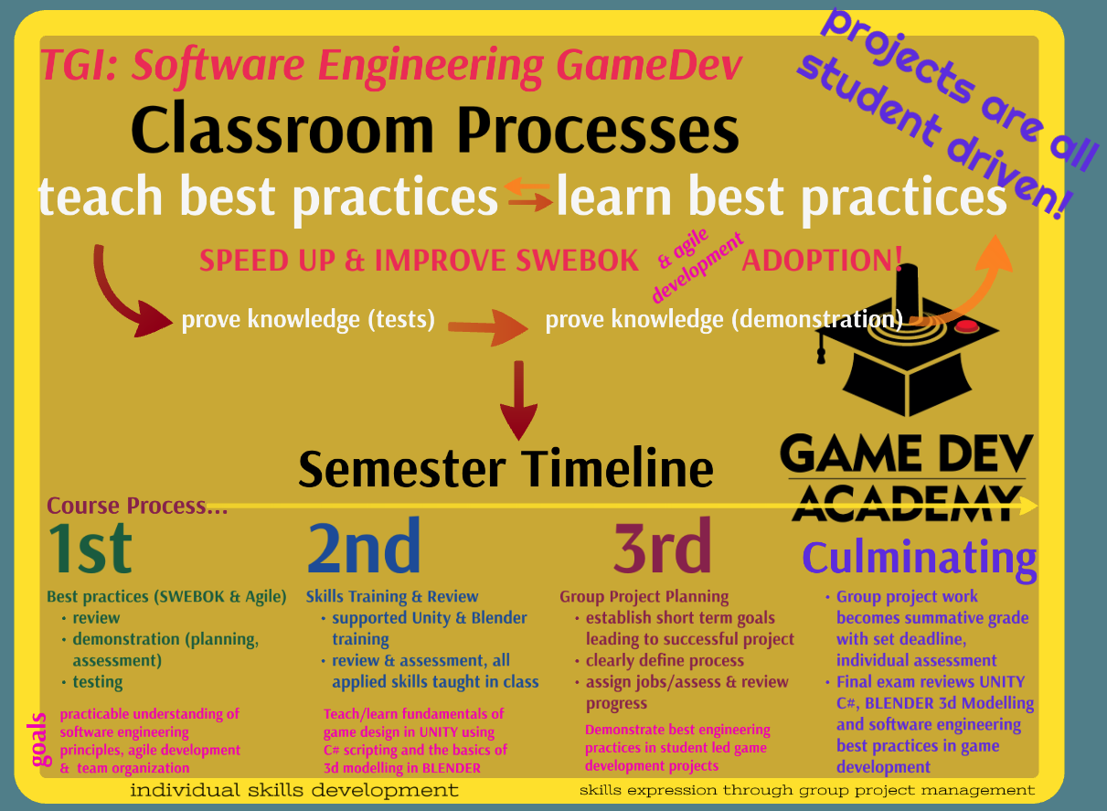 In our software engineering course students begin grade 11 by training in Unity game development and Blender 3d modelling. These challenging technical skills were (I thought) the biggest hurdles, but it turns out they weren’t at all. We’re at the point now where the grade 12s teach the technical training in only a couple of weeks and then support junior students in a live software development environment. Students are able to produce complex, genuine software engineering and digital creativity with our process. For the students committed to developing these high-demand skills, our technical training gets them there efficiently and supportively.