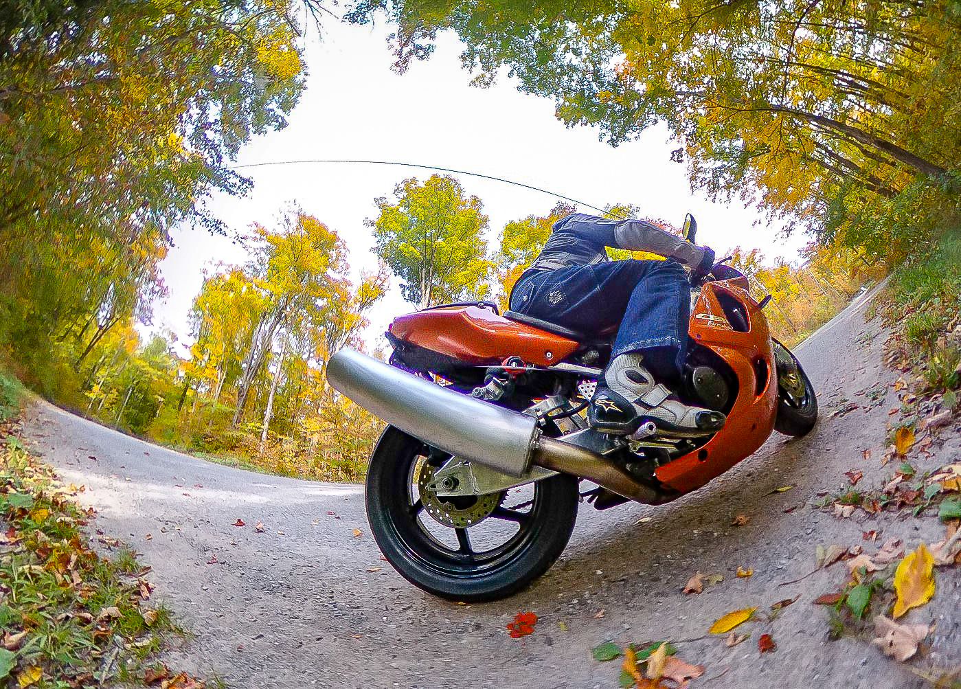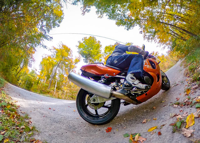 The gimbal did a good job of levelling things when the bike went around corners and I liked the focused-on-riding look of the shots. This experiment got me thinking about a way of fixing a camera to the bike that would match angles with the bike when it leaned over in a corner. I also wanted something that didn’t involve a camera right in front of me while I was riding.