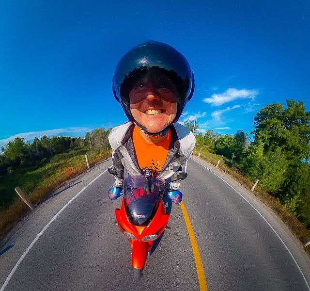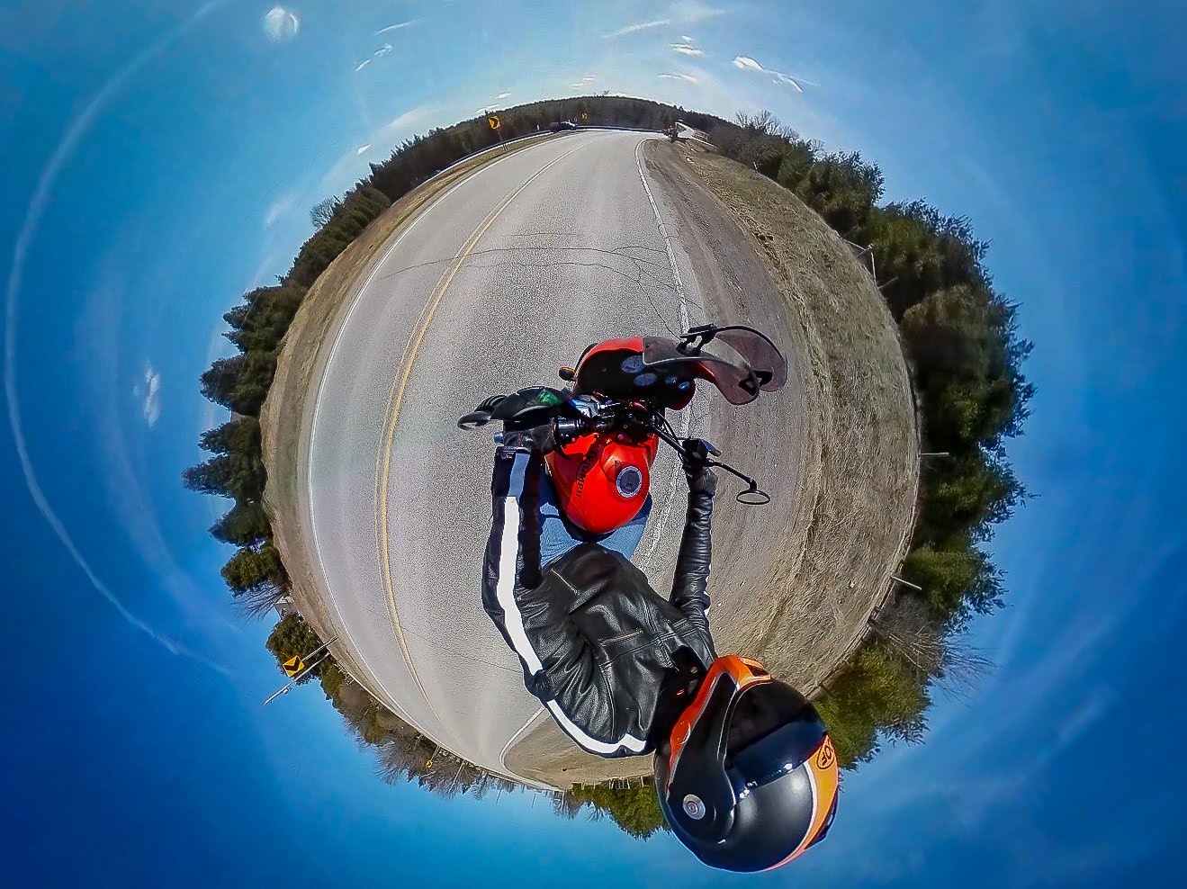 You need a camera with a very wide angle of view. My preference is for a full 360 degree camera as this also lets you form your images into ‘tiny-planet‘ photos, which are a unique, relatively new way to compose a photograph. As part of my job I’ve tried many different 360° cameras, but my favourite for on-bike shots is the Ricoh Theta. It has bright, clear LEDs to let you know what it’s doing and is easy to operate (even when wearing motorcycle gloves) physical controls. It’ll let you preset things on a smartphone if you want, but it works just as well firing the shutter button for video or photo.