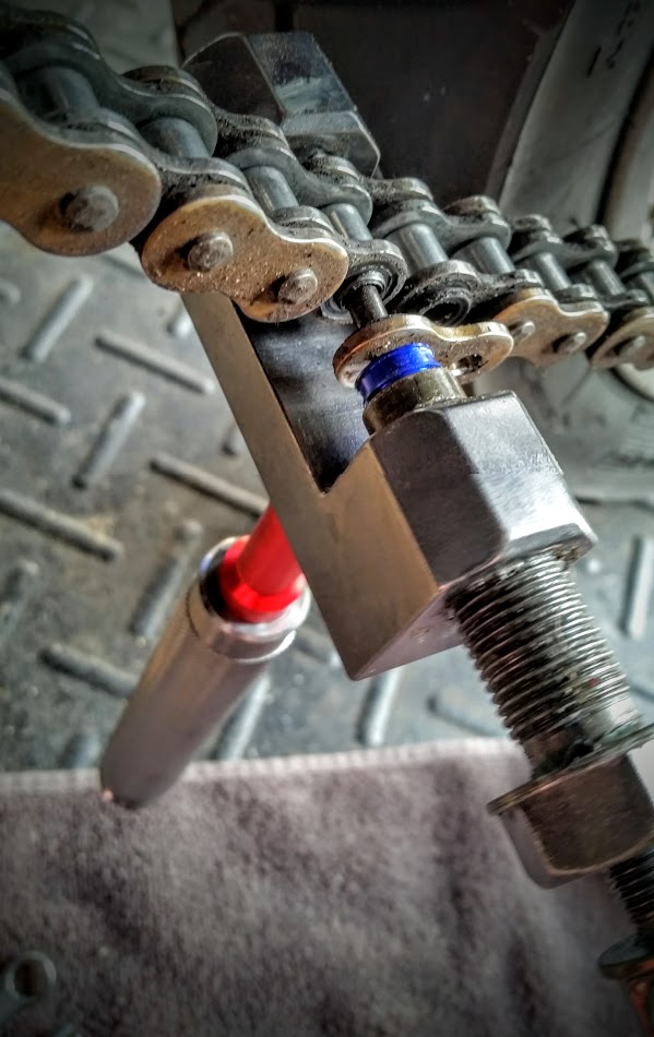 The tool I got last time was quick to set up. The blue 500 size chain pin pusher slotted right in out of the handle where it had been sitting since my last chain change on the Ninja over two years ago.