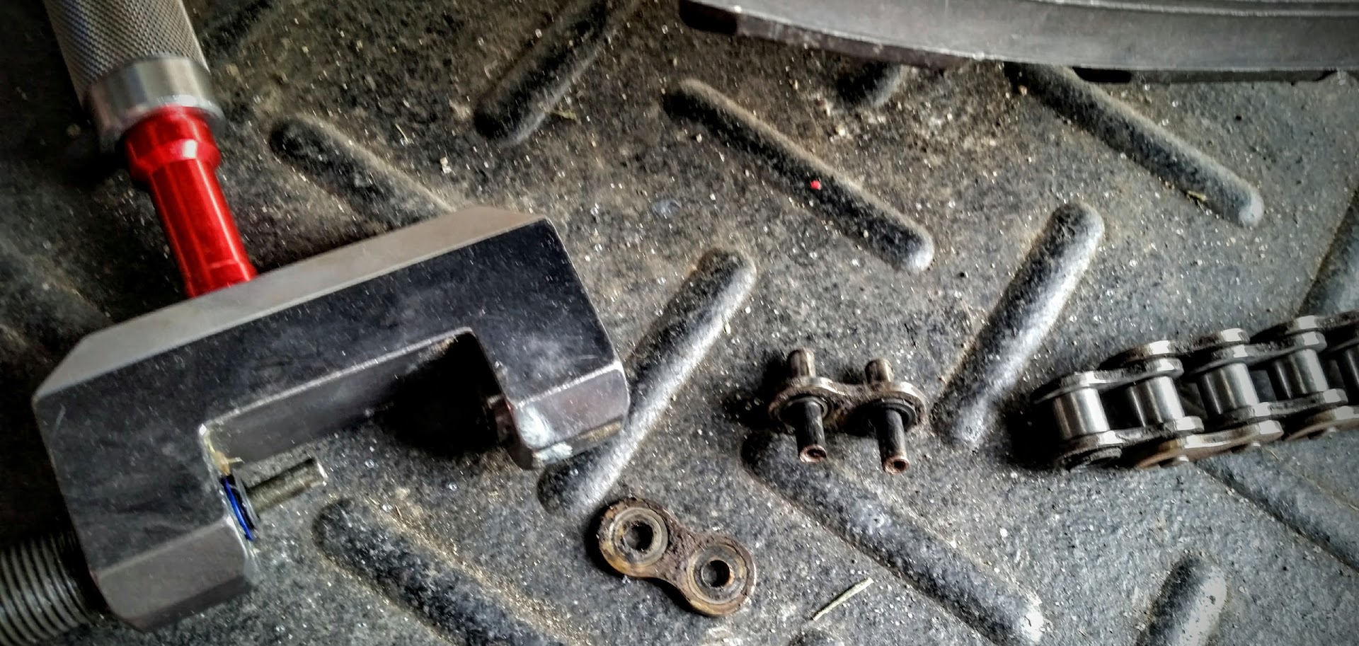 The Tiger chain is a 535 sized chain (wider than the Ninja’s, but the same pitch length between the links – the Ninja was a 520 chain). With the pin pusher piece in place I tightened the outer bolt with a 10mm ratchet and it easily pushed the pins out of the old master link with only mild force on a small ratchet.