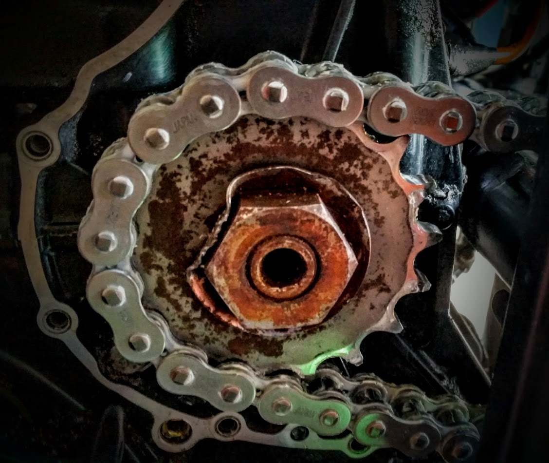 With the old chain removed I spent some time cleaning up the sprockets, which were in great condition. The front sprocket was packed with years of gum from chain lube and it took a while to get it all out, first with a screwdriver and afterwards wiping it up with some WD40. With it all cleaned off it looked like a bit of rust had found its way onto the front sprocket.