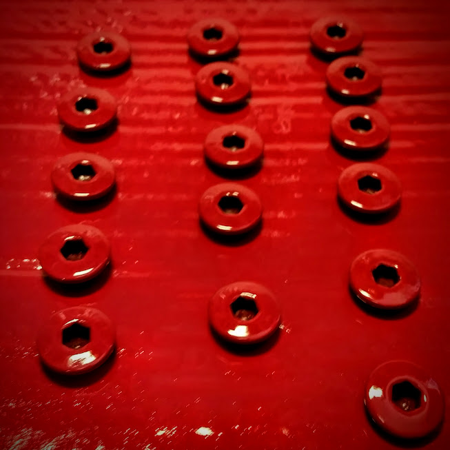 | The rusty, pockmarked disk bolts got dremelled clean and repainted too. |