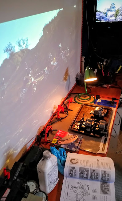 The brake caliper rebuild moved into the ‘nerd-lab’ downstairs where my son does his lego and I usually focus more on digital tech. With Why We Ride playing on the projector I got to enjoy HEAT while I rebuilt the rear caliper.