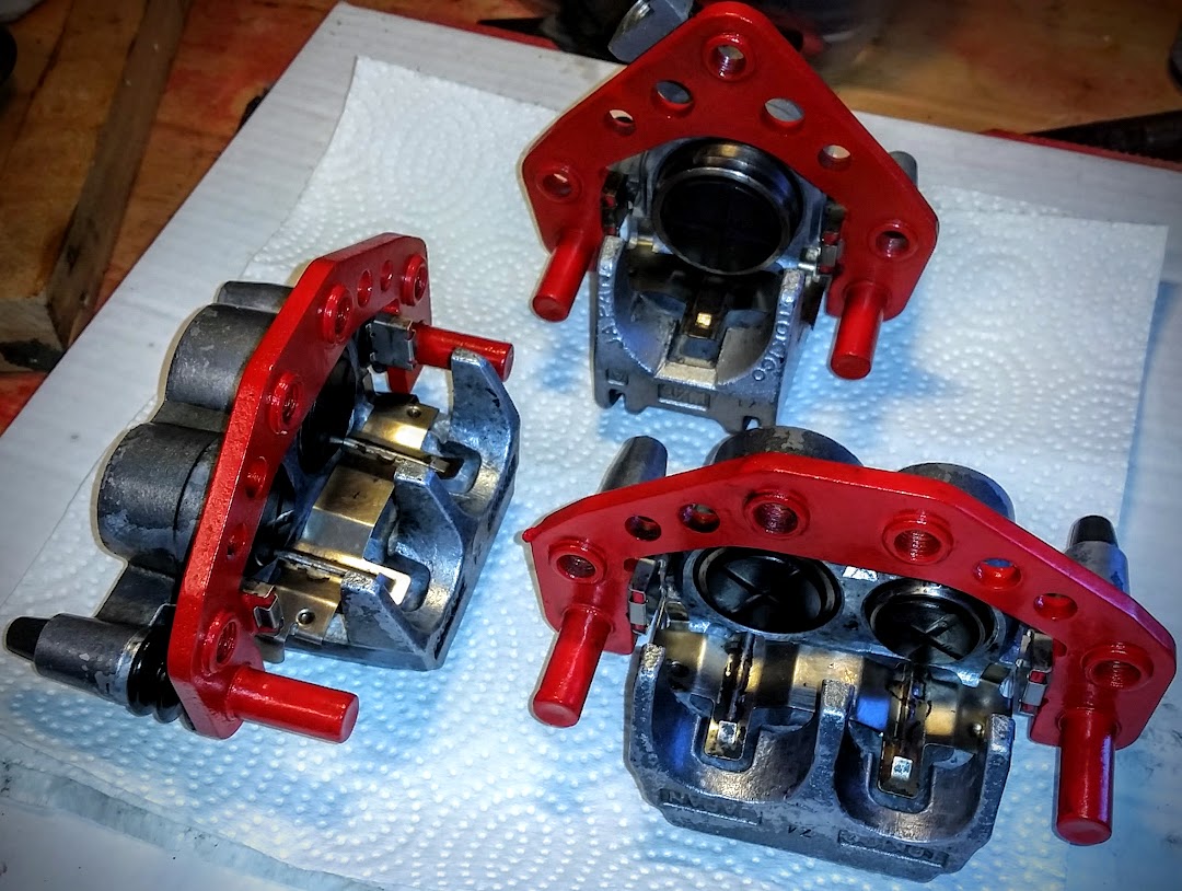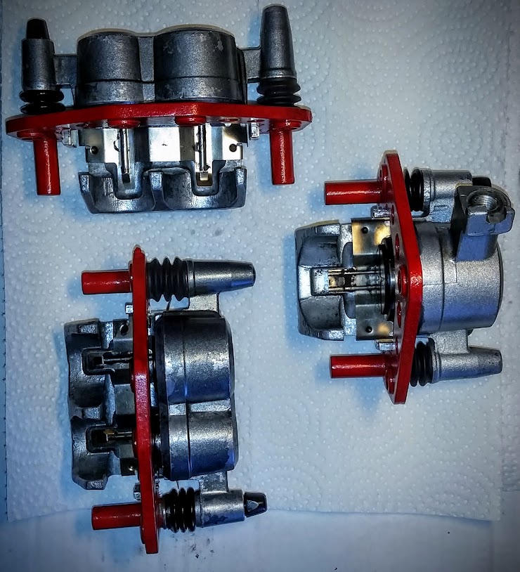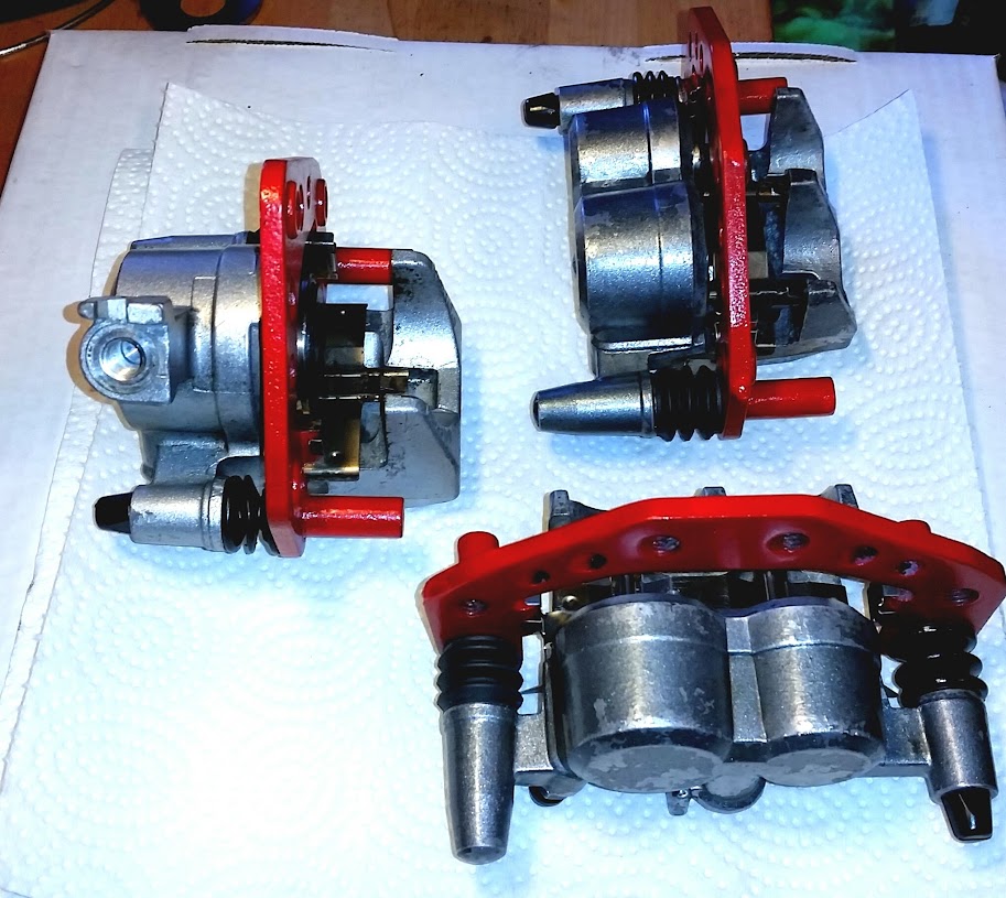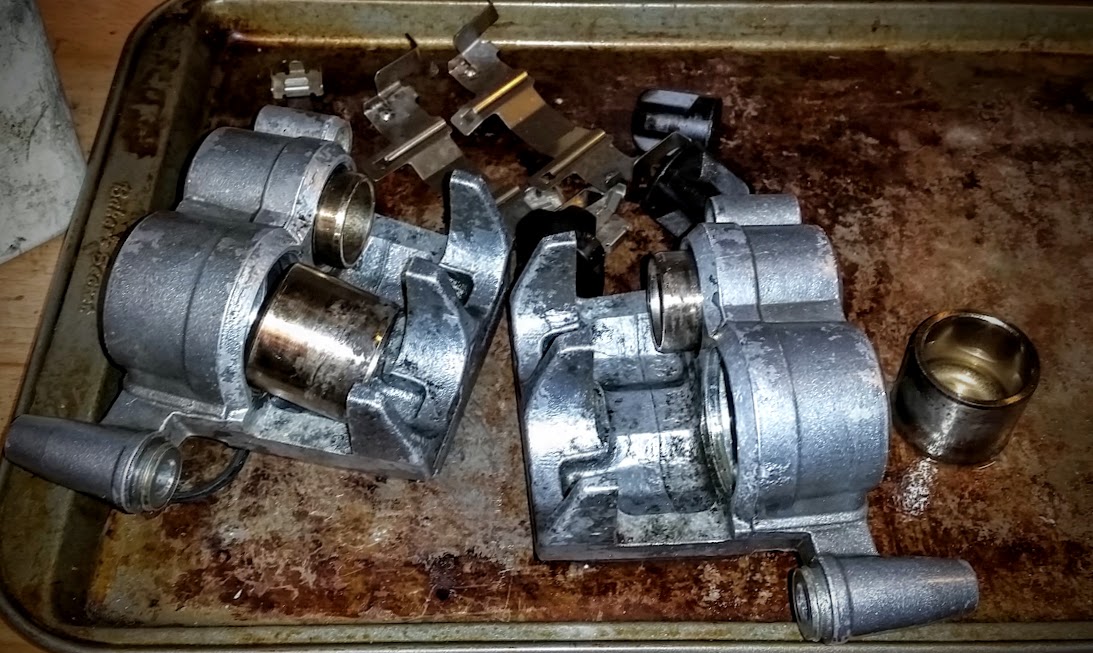 | The front calipers are cleaned up and blown apart, waiting for their rebuilds, probably later this week. |