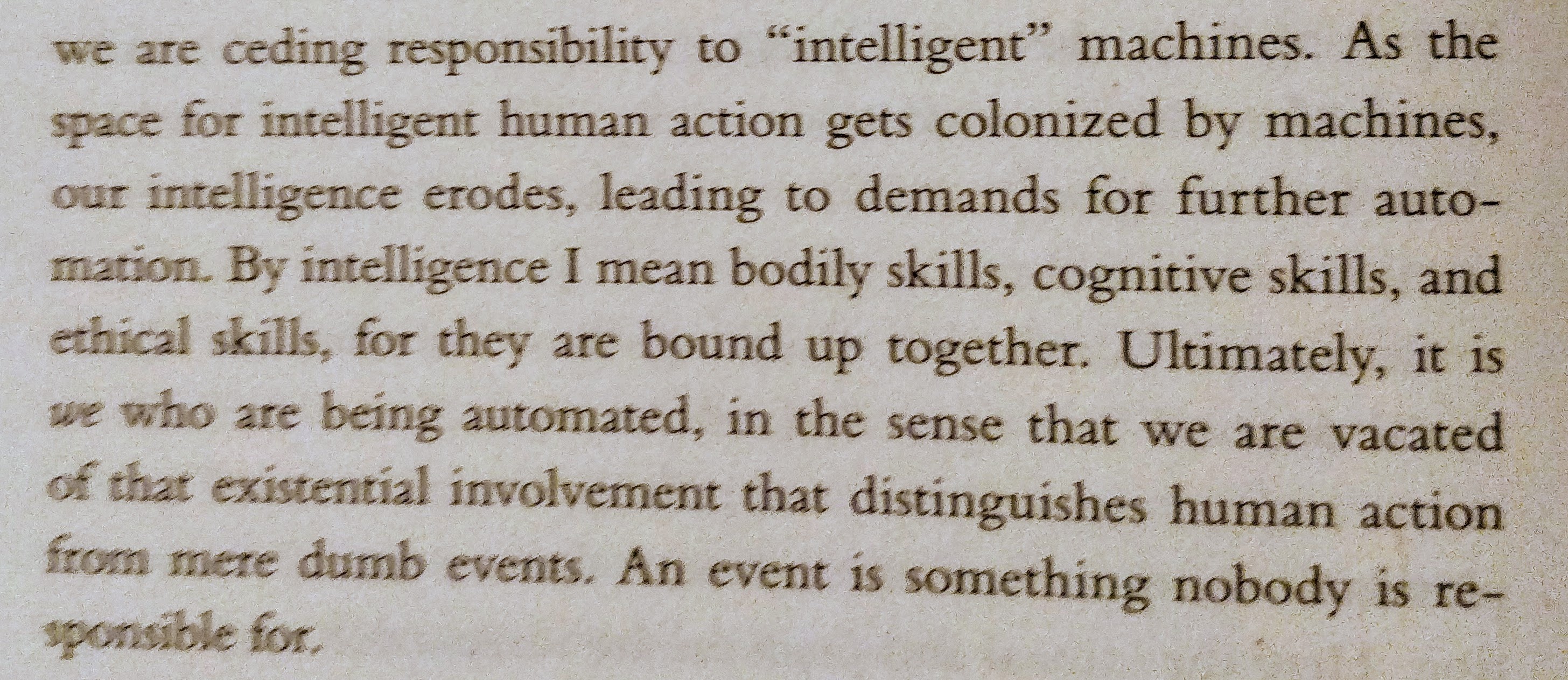 It’s a challenging read, but also an opportunity to wake up from the progress pills everyone has been popping and understand that being human isn’t about efficiency and management, it’s about agency.