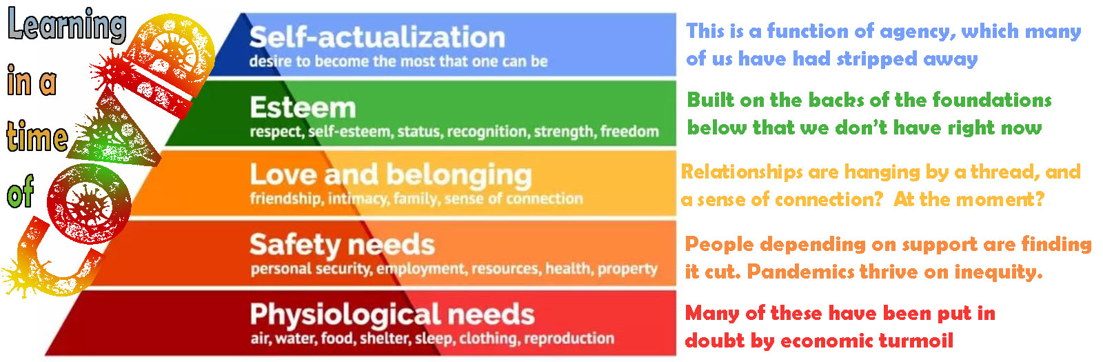 A wise colleague said this in one of our earliest online remote meetings and it changed my mind about how to teach in a pandemic. My reaction in a crisis is to display initiative and work to help people, but systemic paralysis was followed by a lurch into elearning with zero support and then a series of baffling changes of direction by the Ministry in terms of what technology we can use.