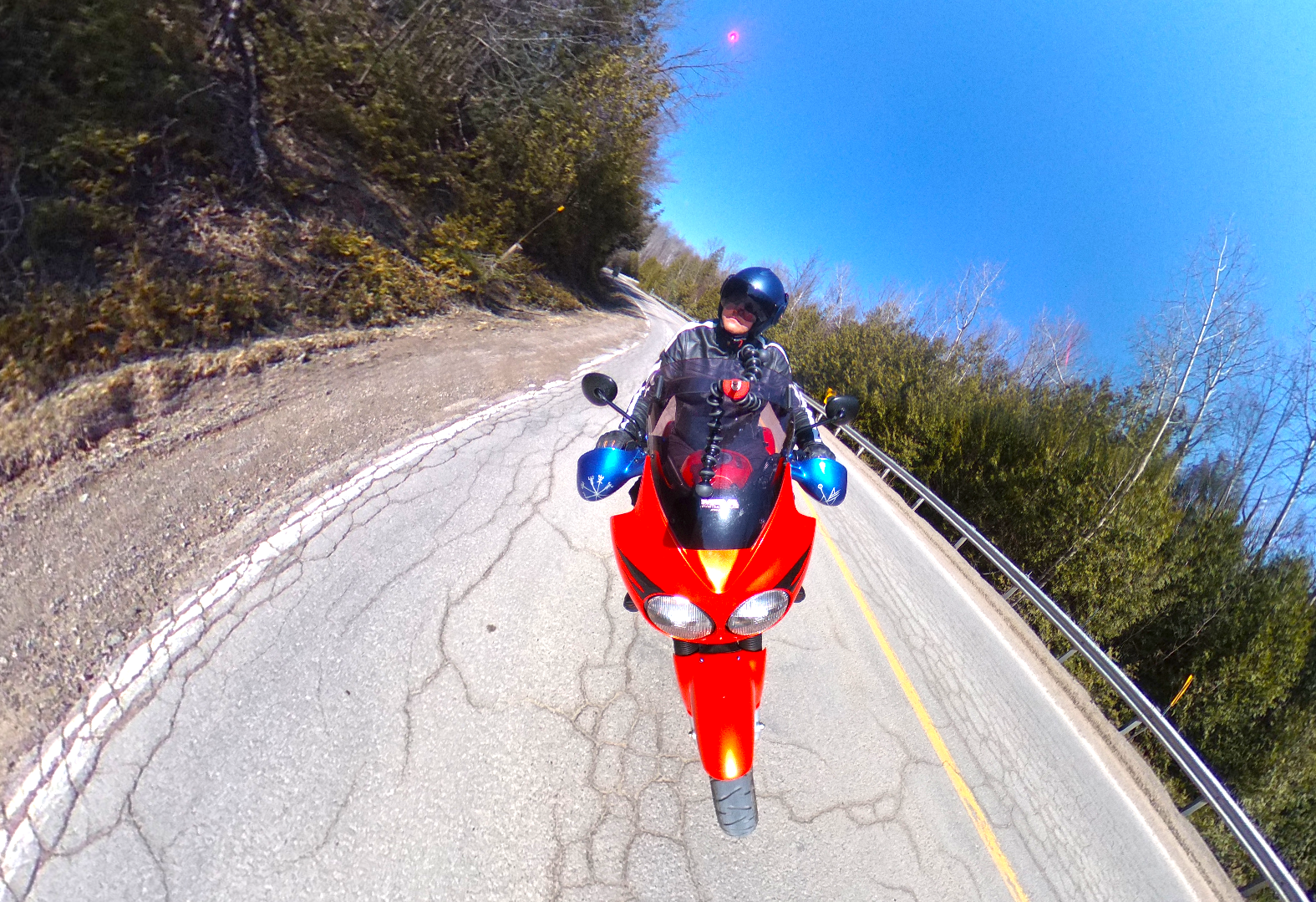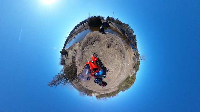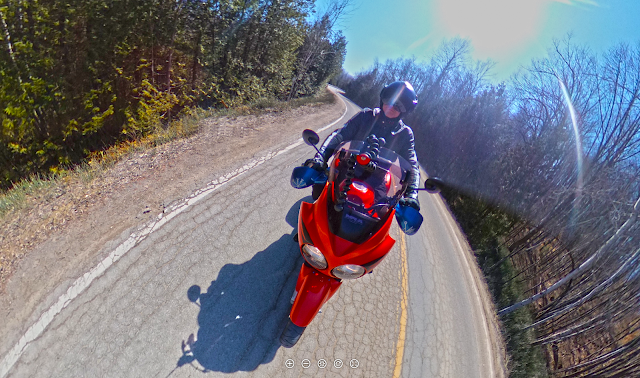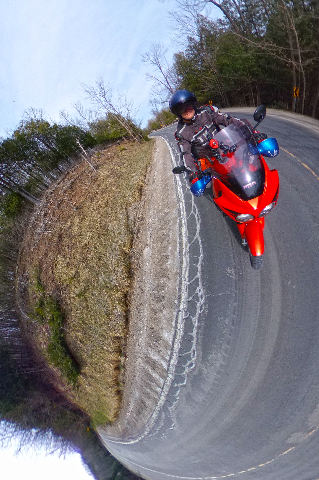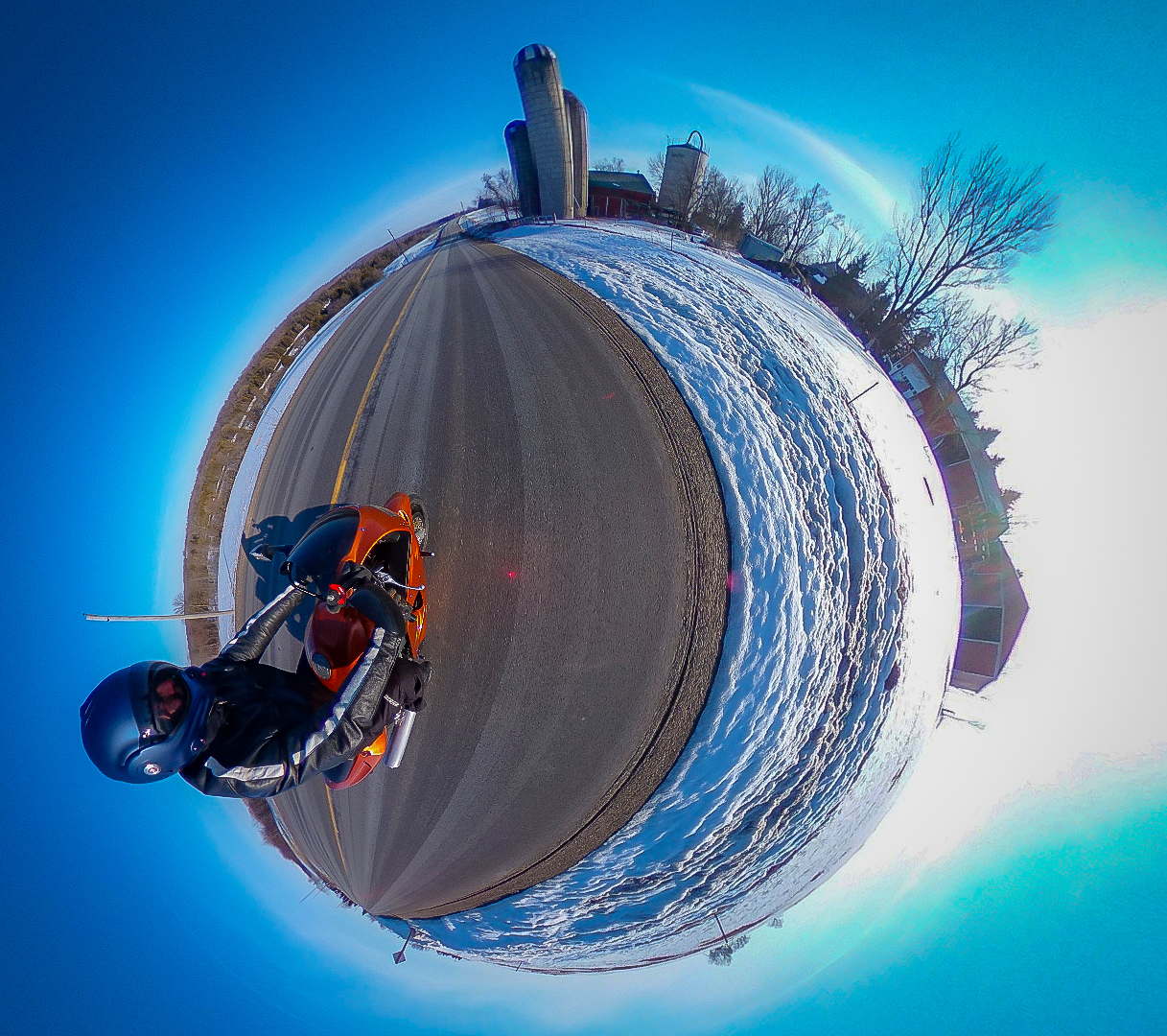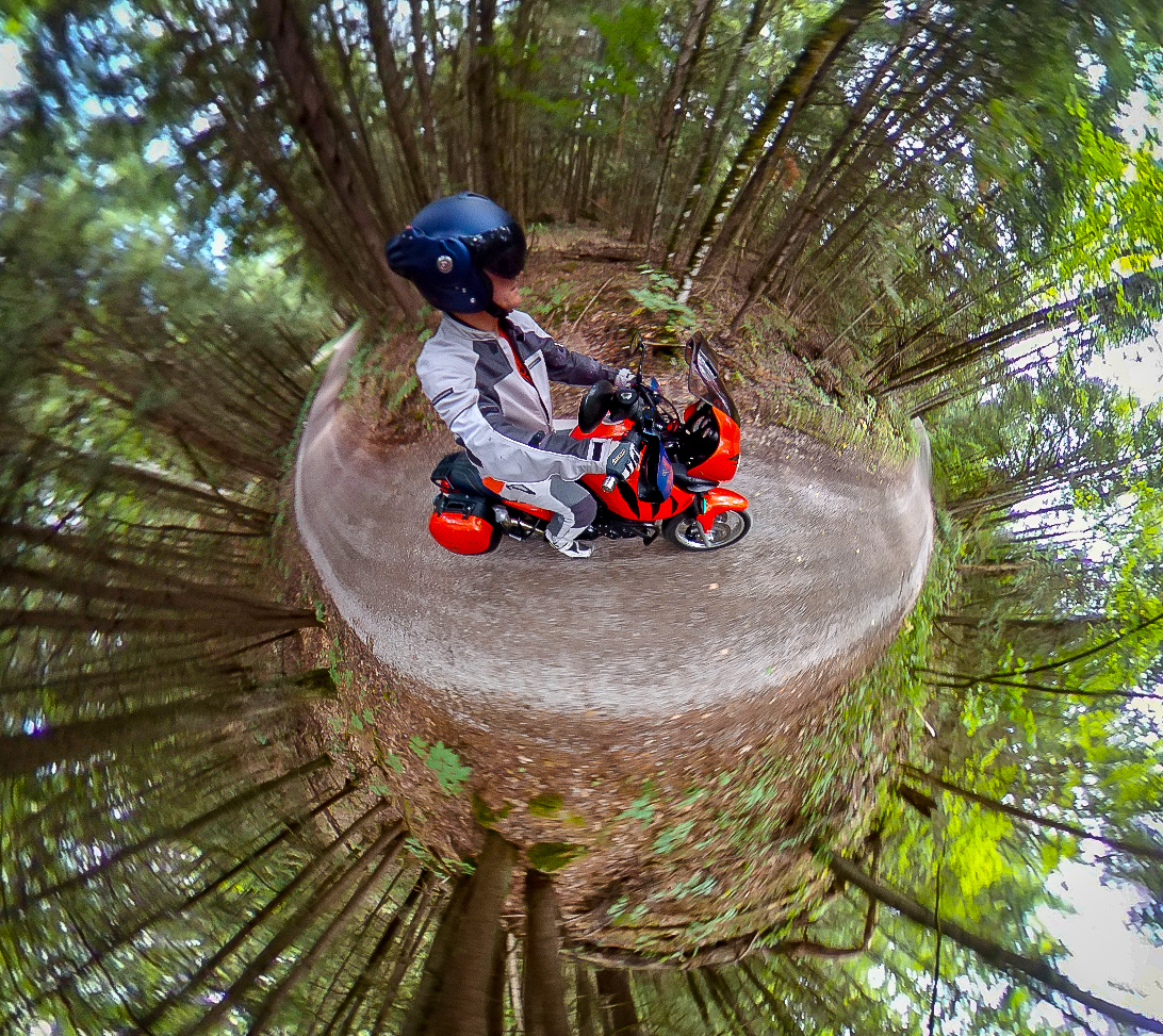 On bike photos were taken with the Ricoh Theta 360 camera attached to the windshield with Lammcou GoPro Phone flexible tripod. The camera was set via my smartphone to take a photo every 10 seconds. I then set and forgot about it and enjoyed the ride. If you’re curious about 360° on-bike shots, there are more details here.