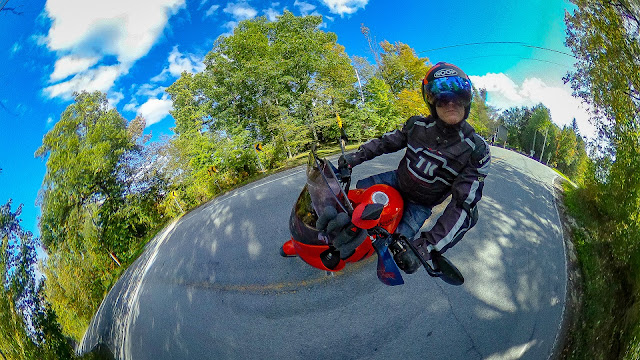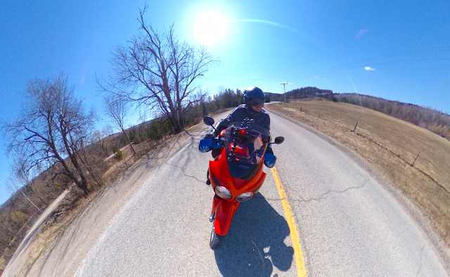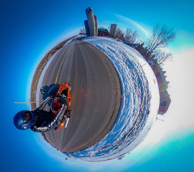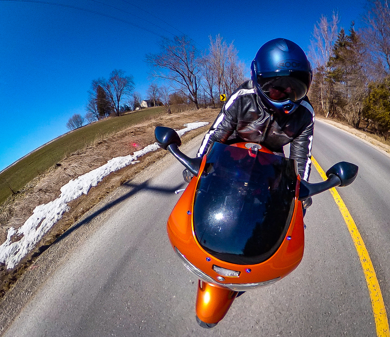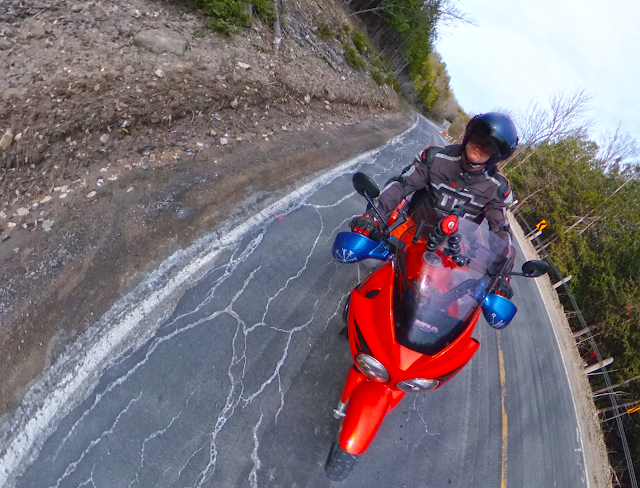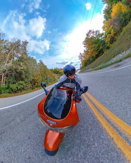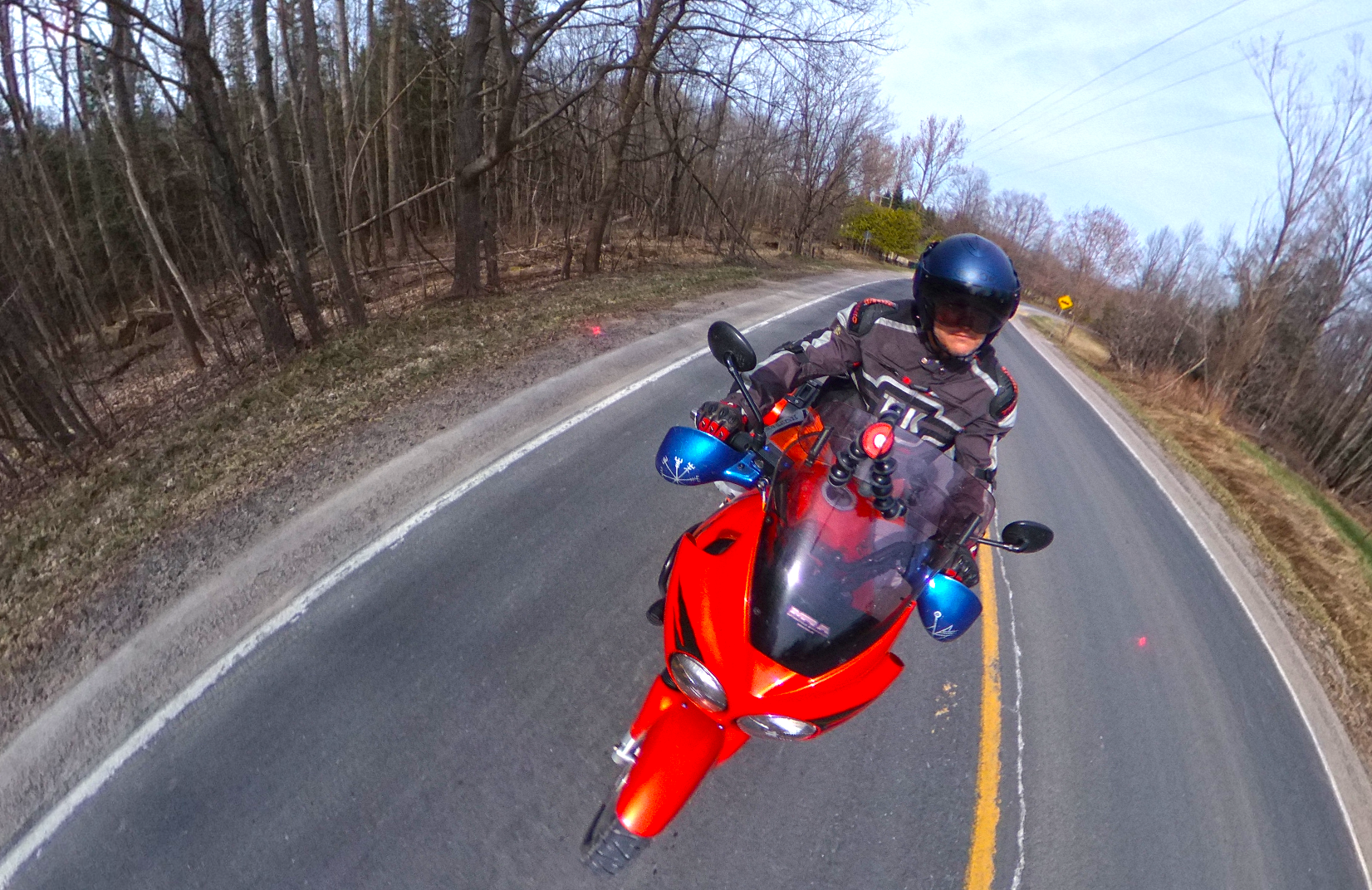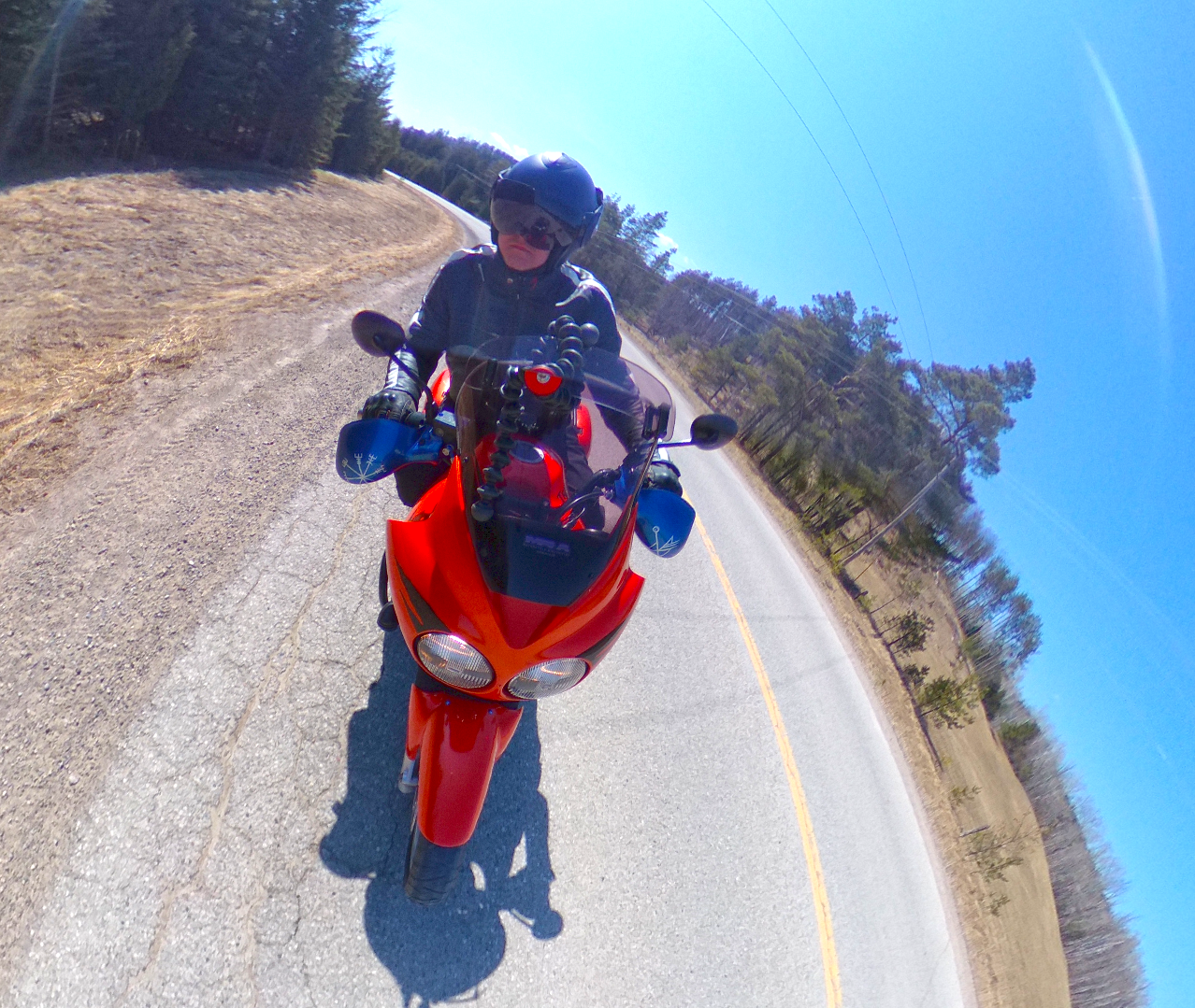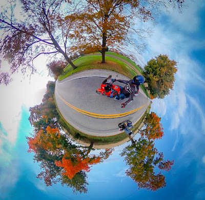On bike photos were taken with the Ricoh Theta 360 camera attached to the windshield with Lammcou GoPro Phone flexible tripod. The camera was set via my smartphone to take a photo every 10 seconds. I then set and forgot about it and enjoyed the ride. If you’re curious about 360° on-bike shots, there are more details here.