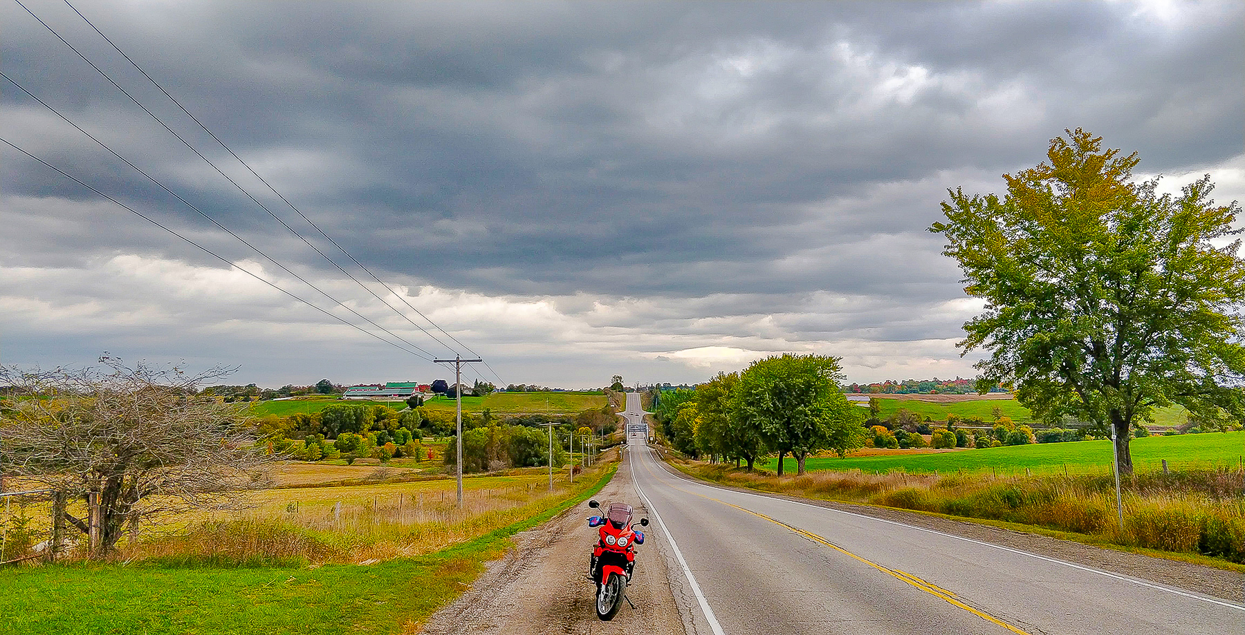 On a cool Saturday afternoon I took a 90km loop southeast to a part of the Niagara Escarpment I don’t usually ride as it’s too perilously close to the GTA. I found a few curves and enjoyed the Niagara biosphere green space before blundering too close to the cidiots lined up to get into the only apple farm they’ve hear of. Once clear of the madness of lining up to buy apples, I found myself heading back home as the sun was setting into a wall of clouds hinting at the days of rain to come.