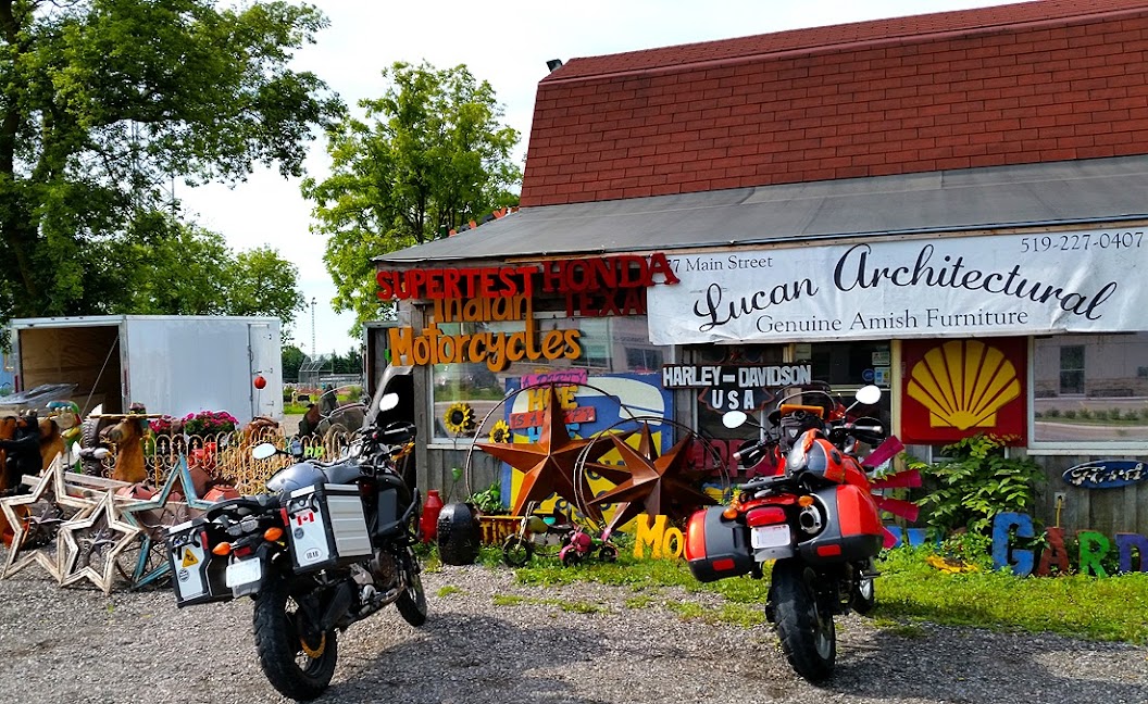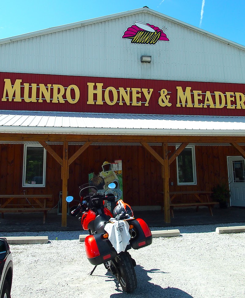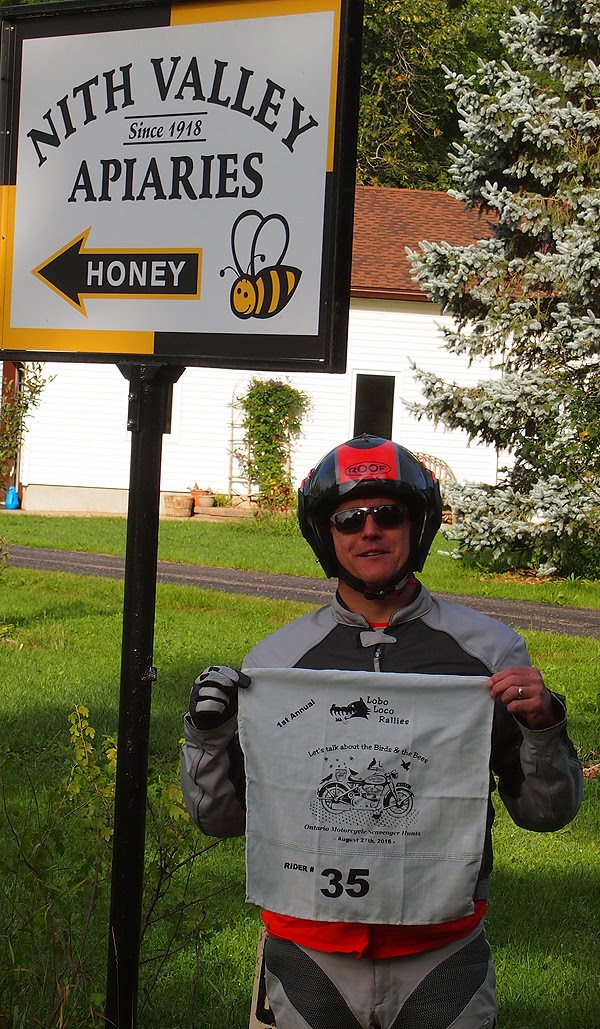The theme of this rally was birds and bees, so locations had some kind of connection to that idea and included everything from apiaries to bird statues. Since neither of us enjoy urban riding on hot summer days, we plotted a route that would take us cross country and out to the shores of Huron before looping back around to Brantford. Being new, we were afraid we’d bite off more than we could chew; we did anyway despite reducing our route goals half a dozen times.