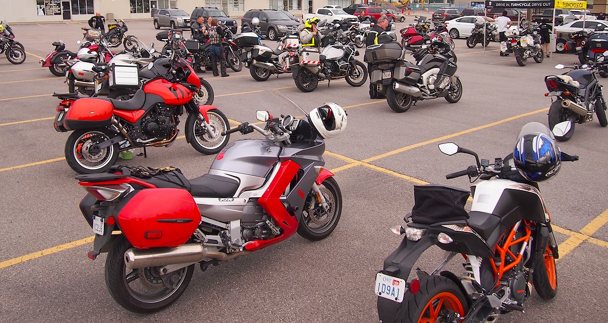 | After riding hundreds of kilometres during the rally, everyone saddled up for the last ride home (or to a hotel – a number of riders travelled up from The States to participate, including one who did an 800 mile ride the day before to get there!). |
